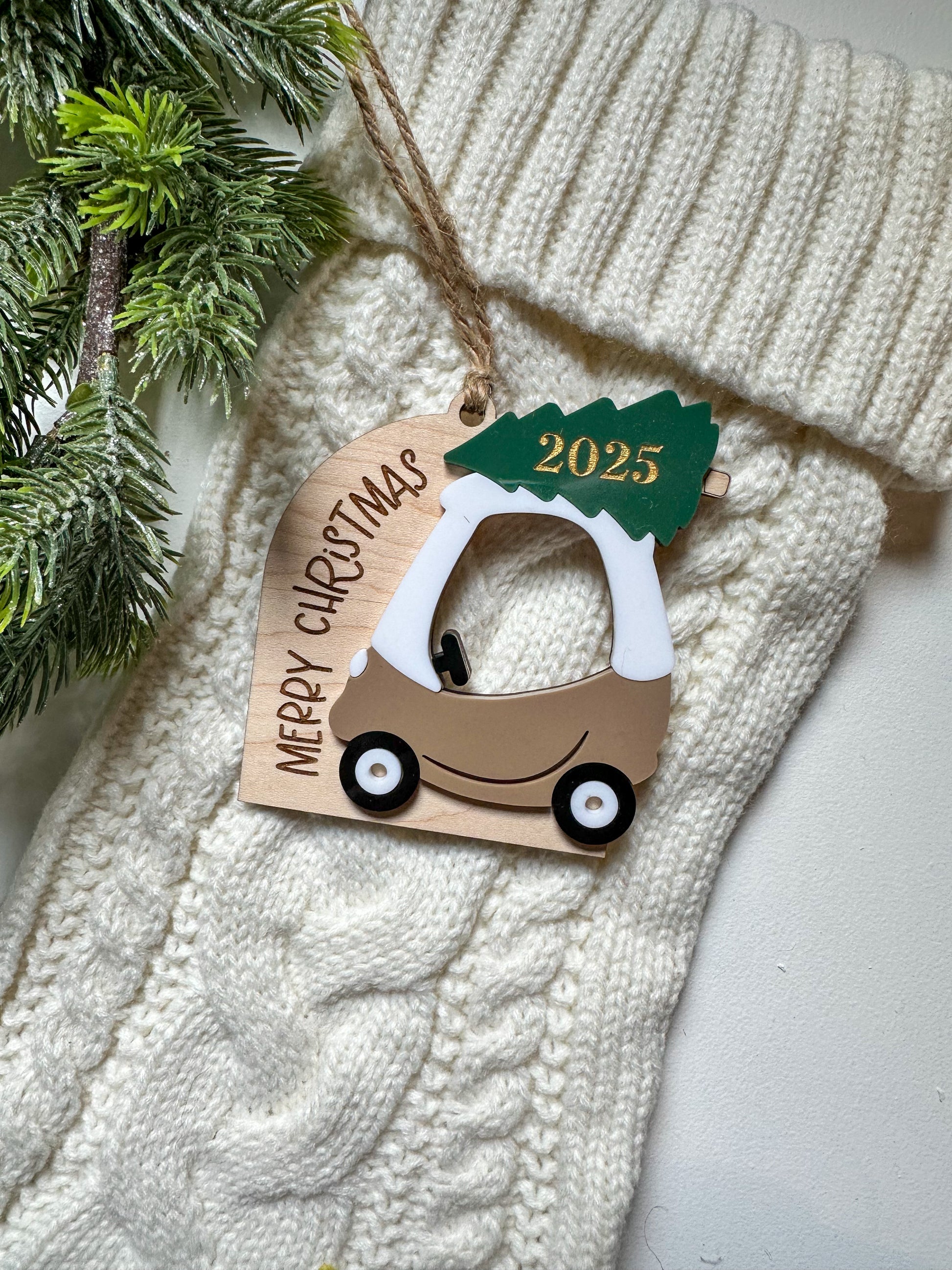 Bring back the joy of those first little adventures with our adorable Cozy Coupe Christmas Ornament! Available in a “First Christmas” or “Merry Christmas” design, this car-shaped keepsake is a nostalgic nod to childhood fun.